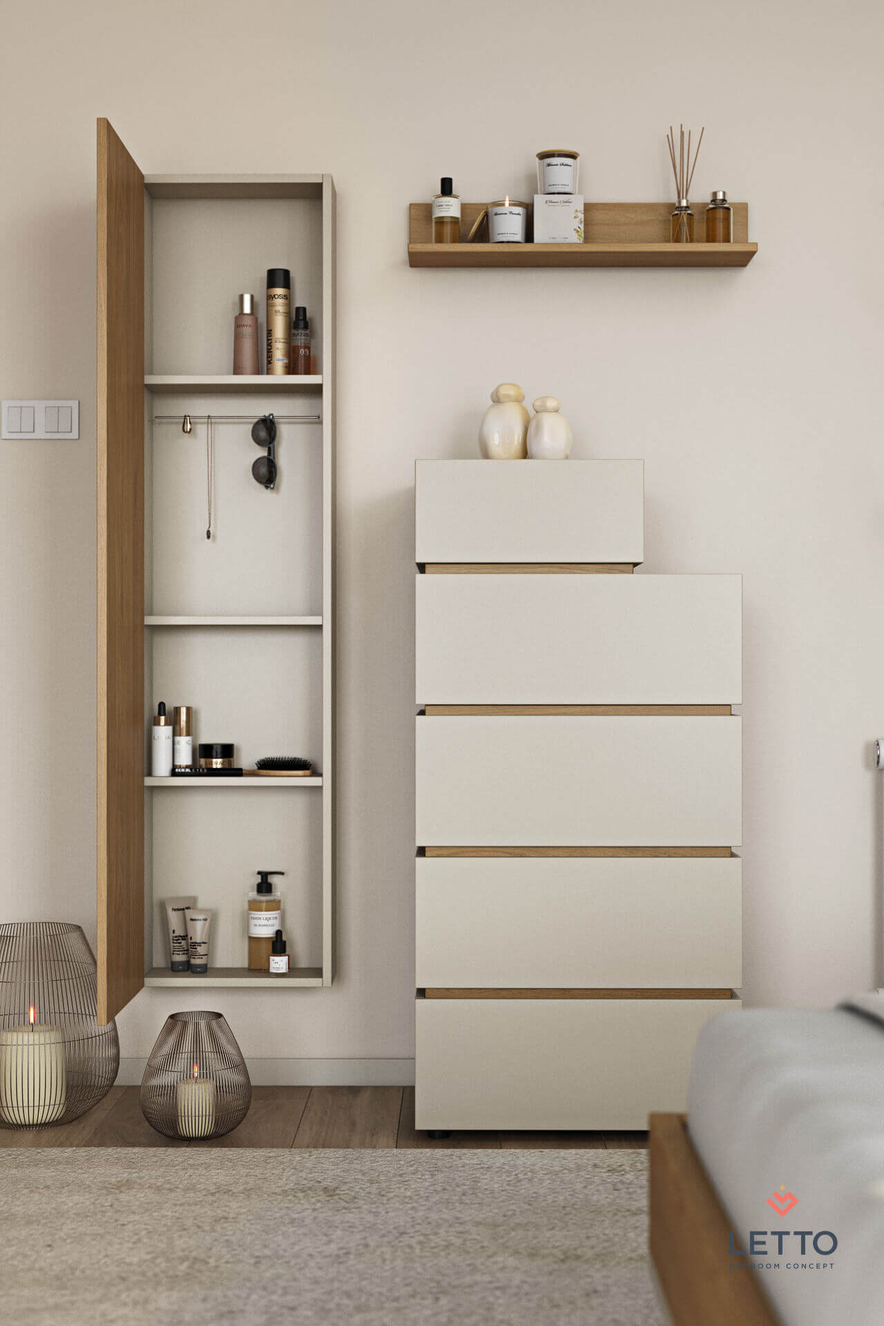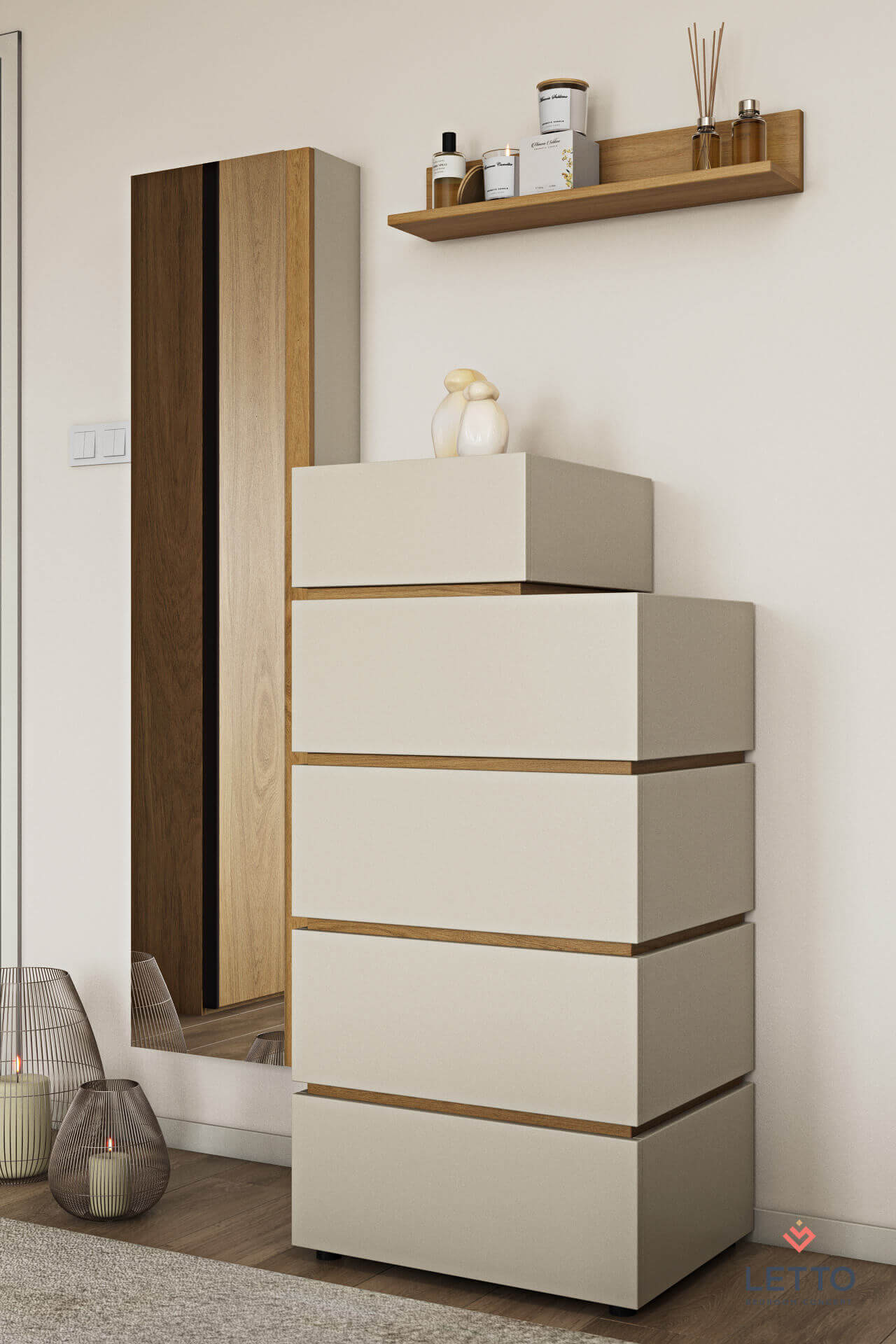 Η συρταριέρα Loft | M.11 διαθέτει πέντε συρτάρια, είναι κατασκευασμένη από μελαμίνη σε χρώμα plain beige (M.11) και συνδυάζεται άψογα με την light oak (M.31) επιφάνεια η οποία υπάρχει στο επάνω μέρος και περιμετρικά στις ακμές του επίπλου.